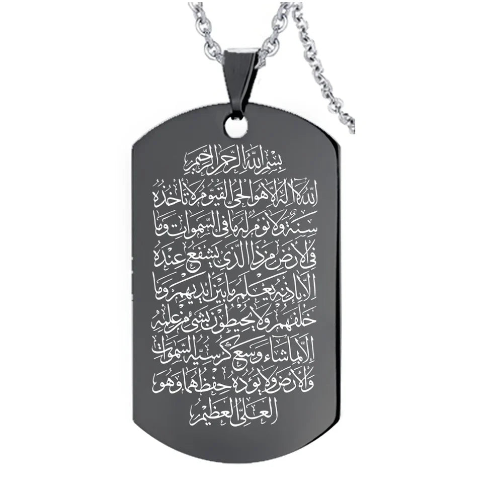 Embrace faith and elegance with this beautifully engraved Ayatul Kursi Tag Necklace, available in two sleek finishes: polished silver and matte black. Featuring the powerful verse of Ayatul Kursi inscribed in graceful Arabic calligraphy, this pendant is a symbol of divine protection, spiritual strength, and inner peace.