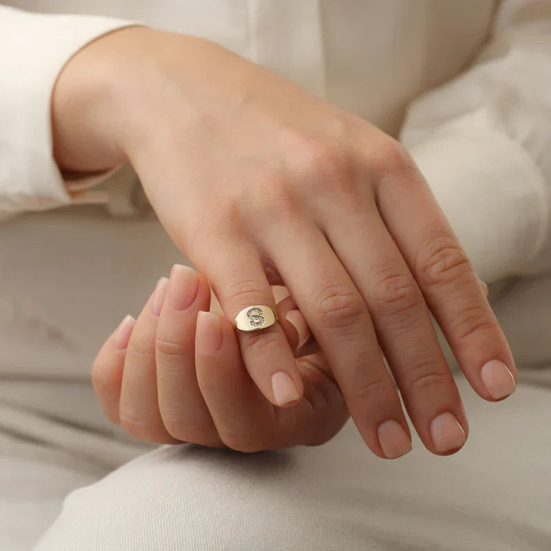 The Dazzling Promise Ring is crafted with a stunning script font, in the lettering of your choosing. This personalized piece will immediately become a part of your daily rotation.