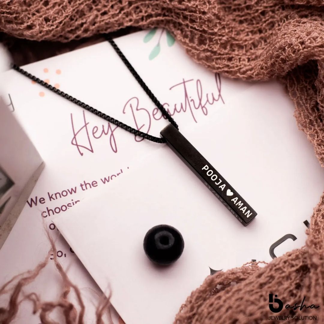 This beautiful black bar pendant with a high gloss finish will add elegance to your neckline. Our 3D bar necklace is a perfect gift for a special occasion on which you can engrave your names and any special dates on all four sides of the bar necklace that your loved ones will relish.
