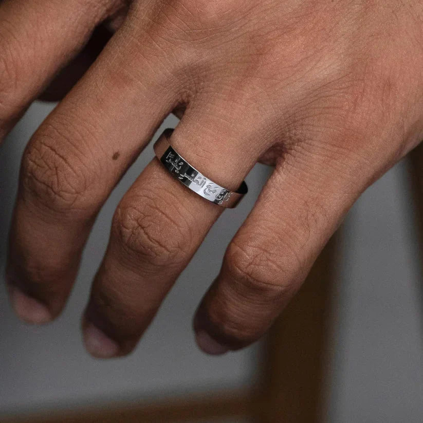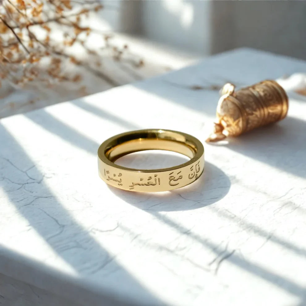 فَإِنَّ مَعَ الْعُسْرِ يُسْرًا “Verily, with hardship comes ease. ”The ring features Allah's most reassuring promise of the Qur'an engraved.